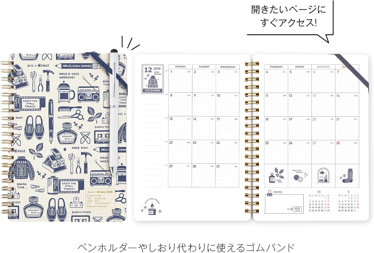 Introducing new colors in the popular diary last year. Kleid Ring Diary collaborates with eric, expressing a world of ingenuity and small things. It expresses the world of eric on the cover, monthly, note pages and details. A slanted elastic band that can be used as a pen holder or bookmark, and a convenient double-sided pocket on the final page. Available in 3 colors.