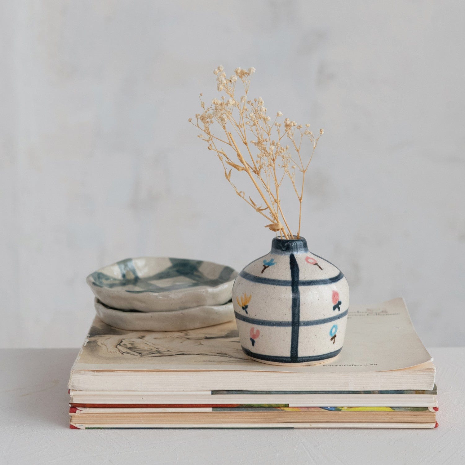 This hand-painted terra-cotta vase features a charming floral and grid pattern with a unique crackle glaze finish. Each vase is distinct, showcasing slight variations that add to its natural beauty. Perfect for displaying your favorite flowers or as a decorative piece, it brings a warm, artisanal touch to any space.