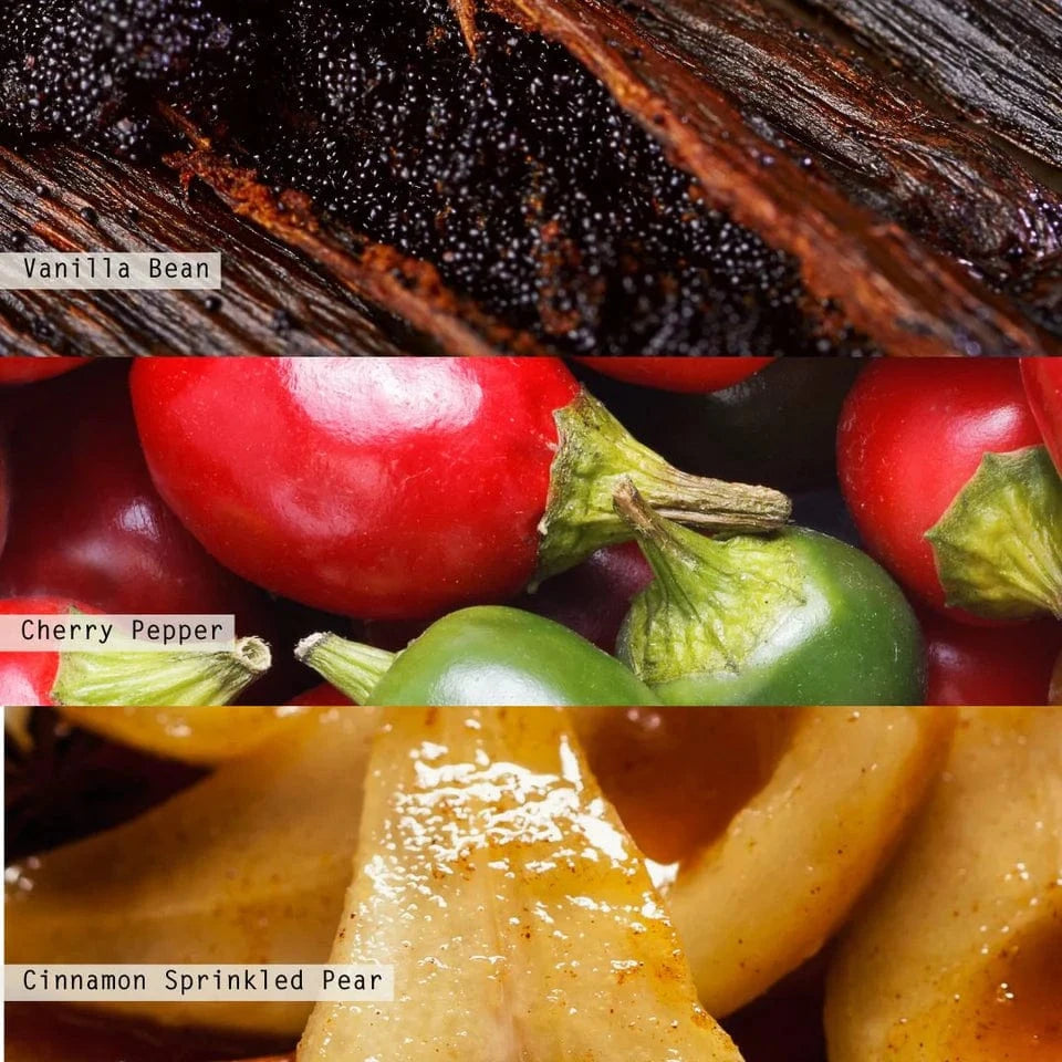 A juicy sweet bite with a sprinkle of cinnamon, cherry pepper, and vanilla bean.