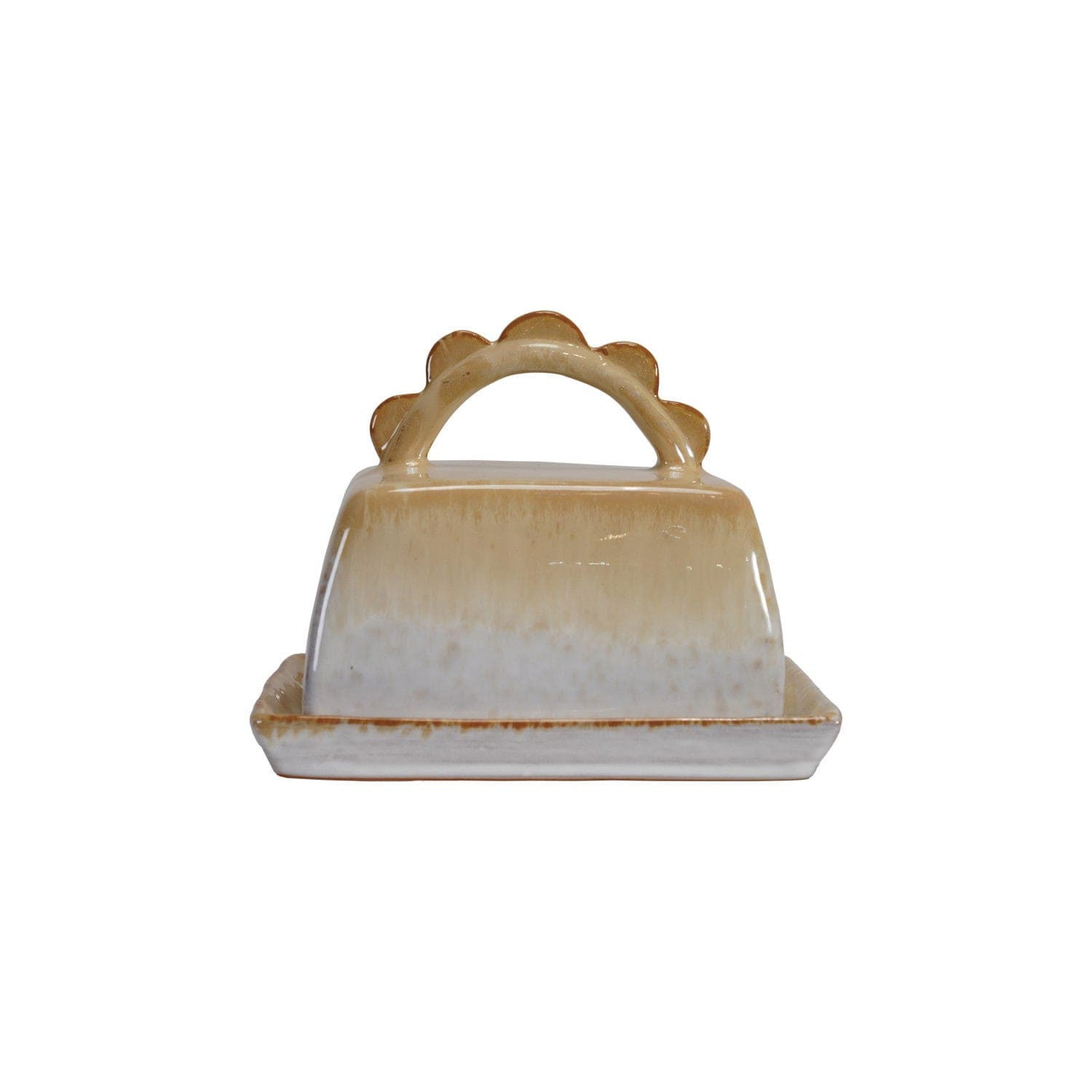 6-3/4"L x 4-1/2"W x 5-1/4"H Stoneware Butter Dish w/ Scalloped Handle, Reactive Glaze, Caramel Color (Each One Will Vary)
