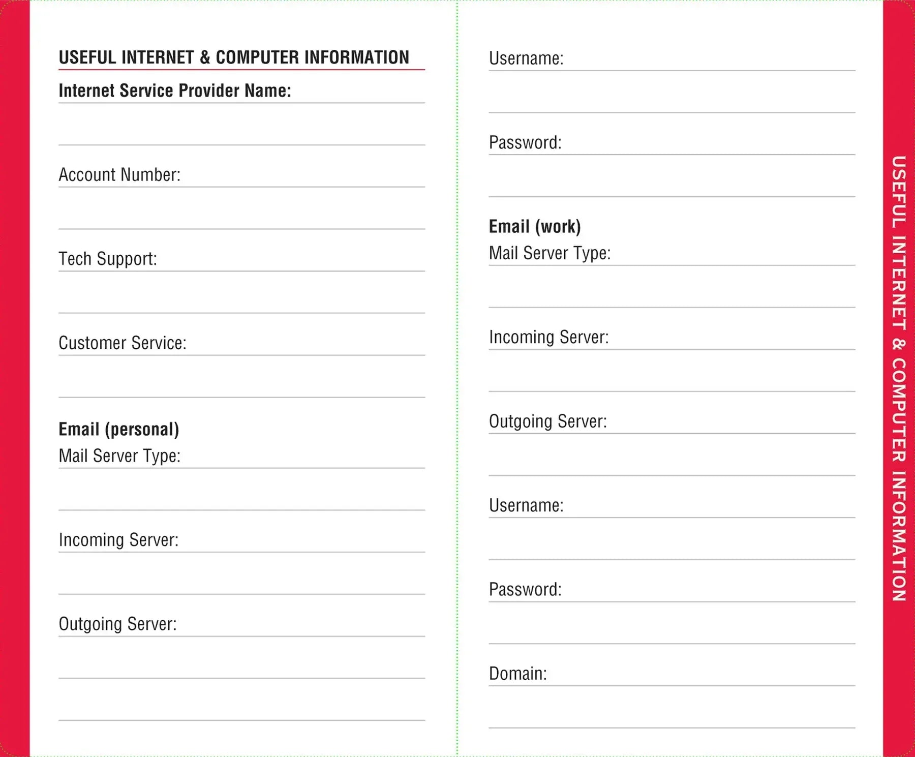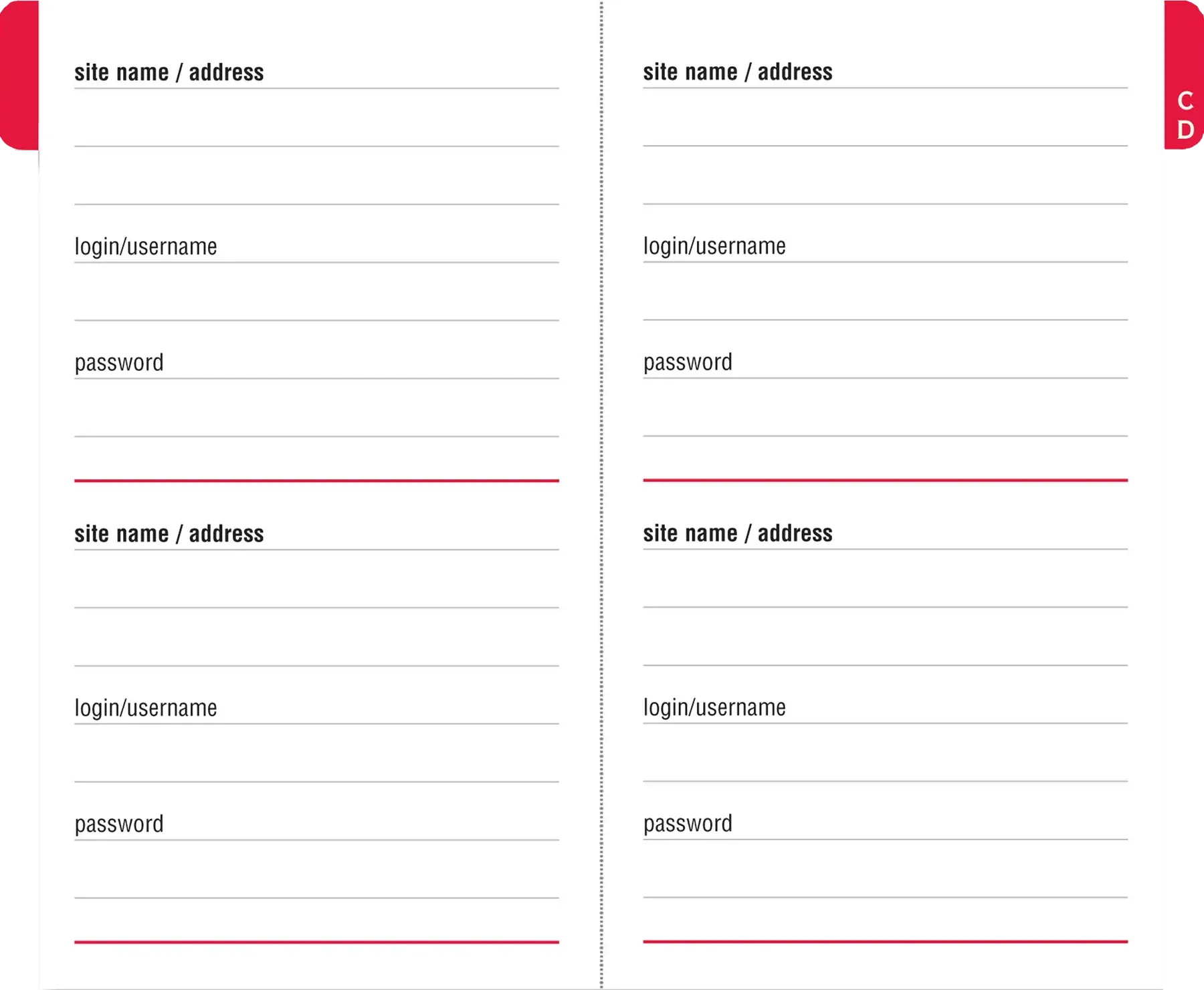 • Tabbed alphabetical pages that provide space for noting website addresses, usernames, passwords, and extra details.