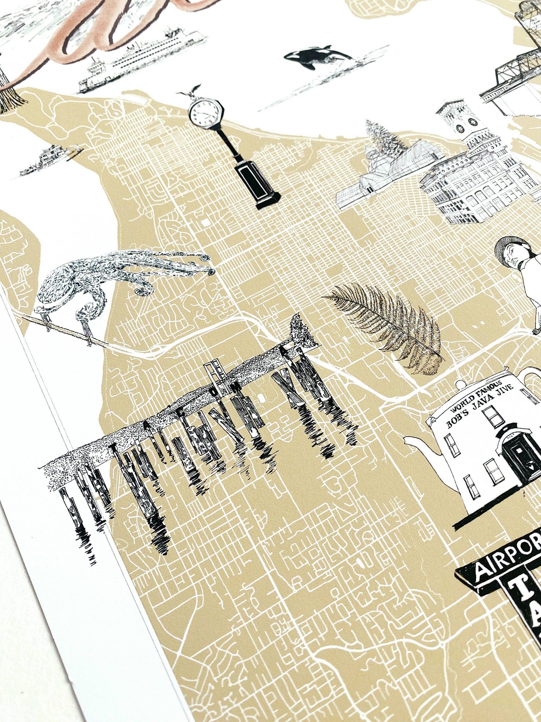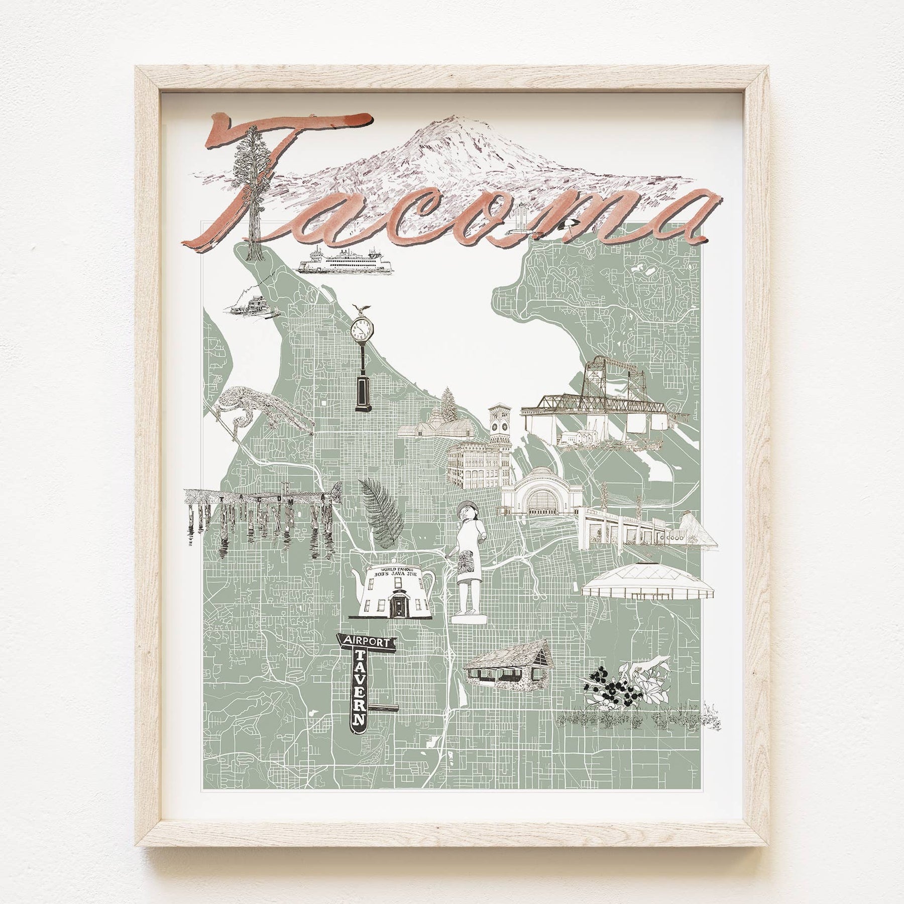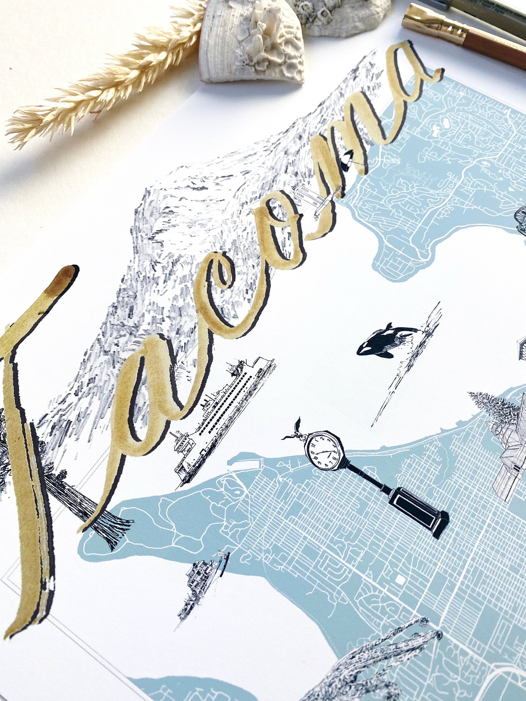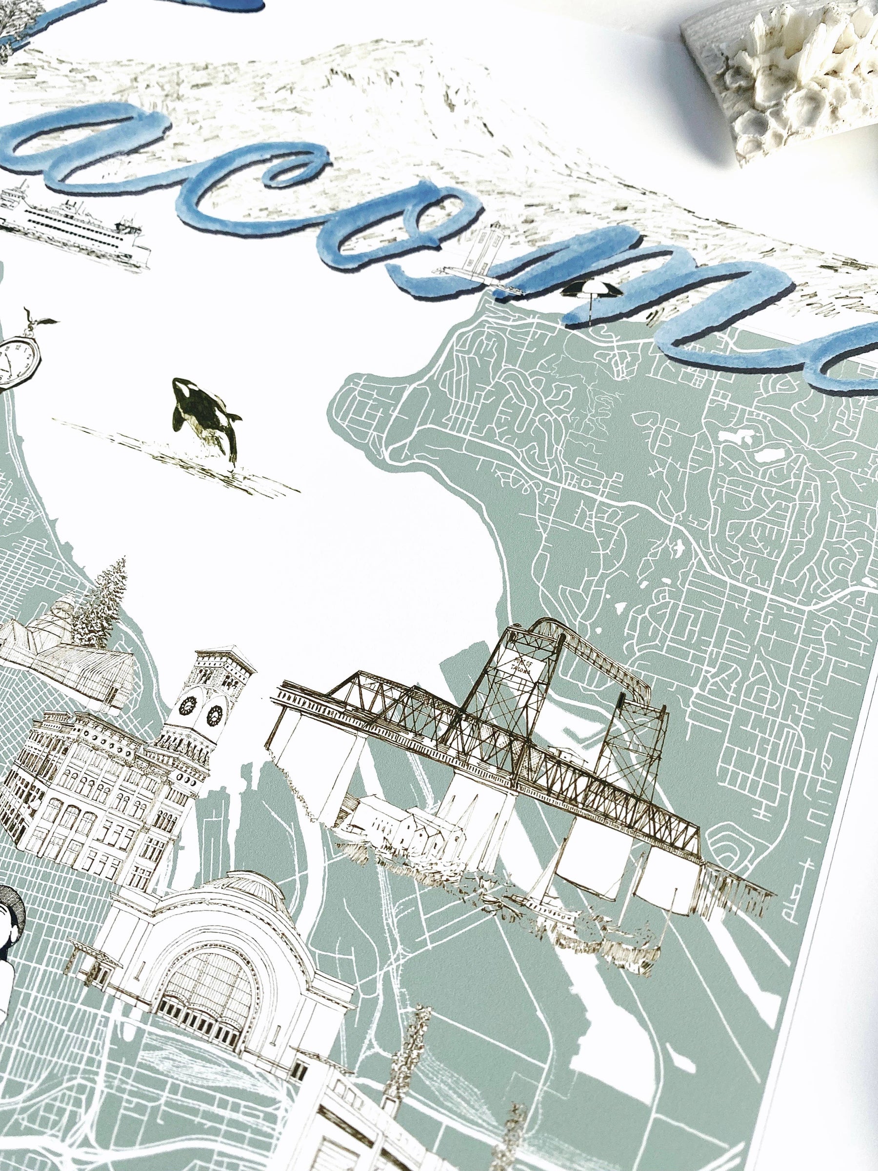 TACOMA Washington "Charms" Landmarks Map Art Prints - The hand-painted cursive TACOMA title hovers above my hand-drawn map of the city with sketches of some of T-town's icons or "charms" scattered around, roughly in the area where they exist in real life!