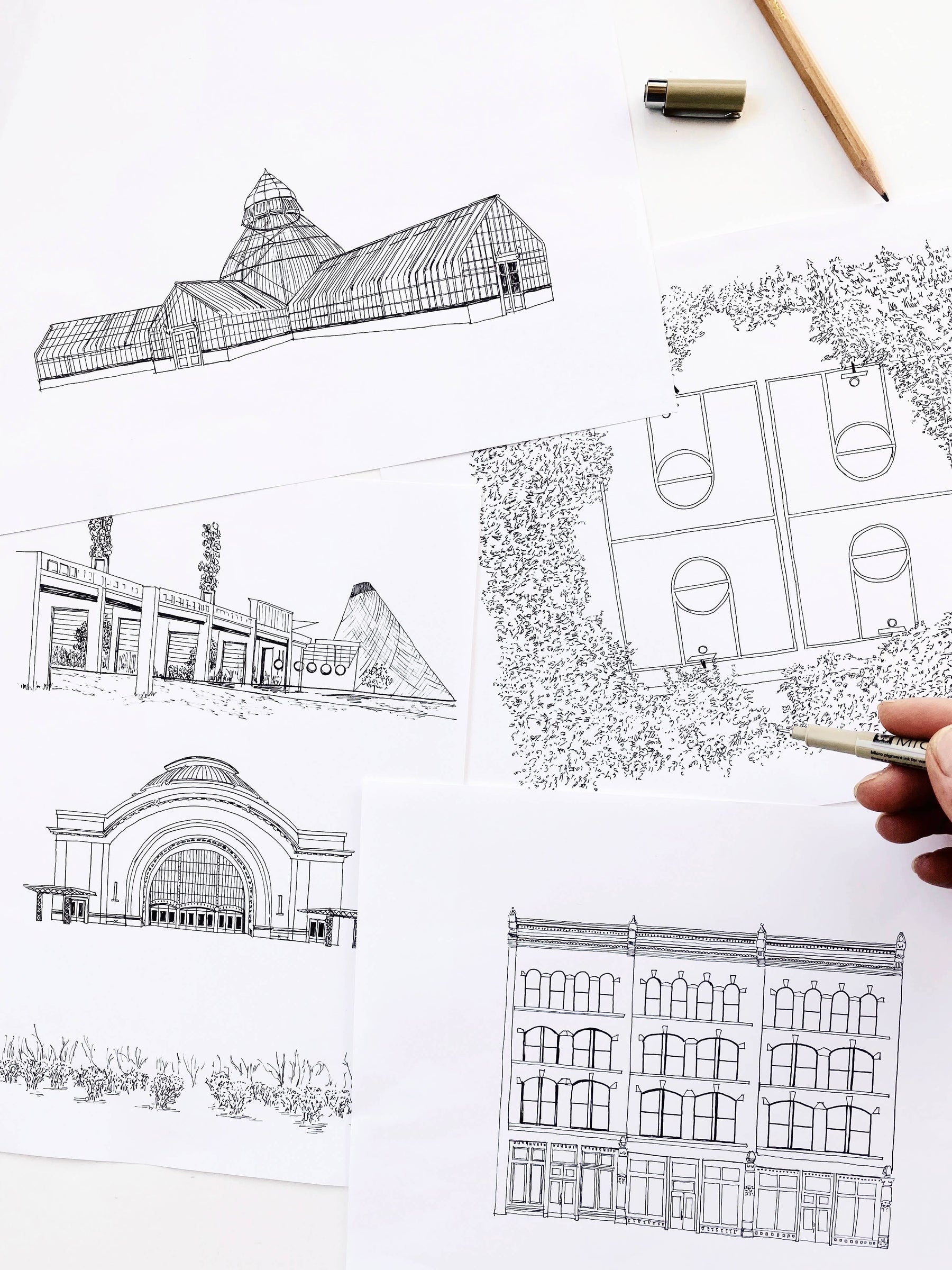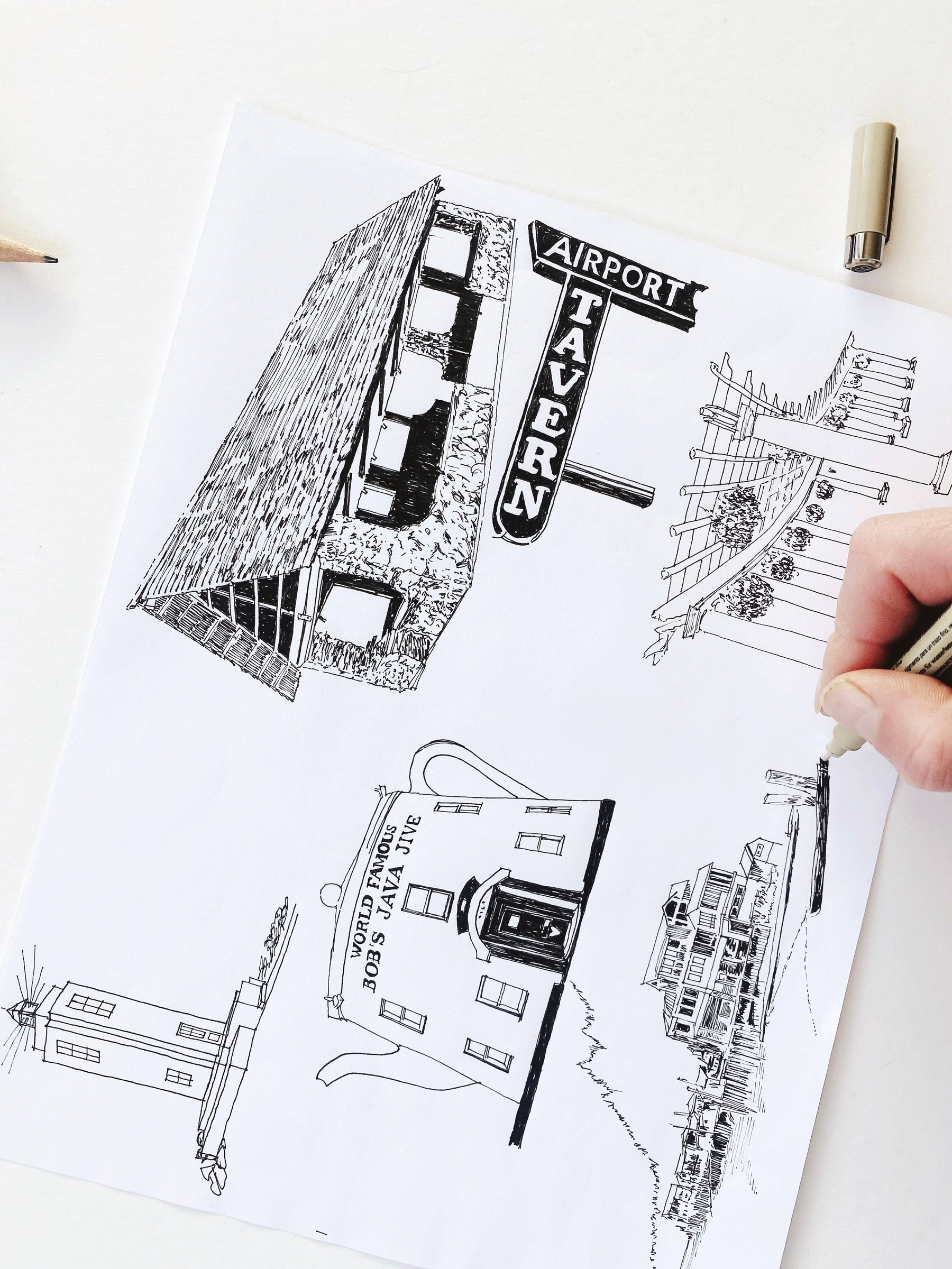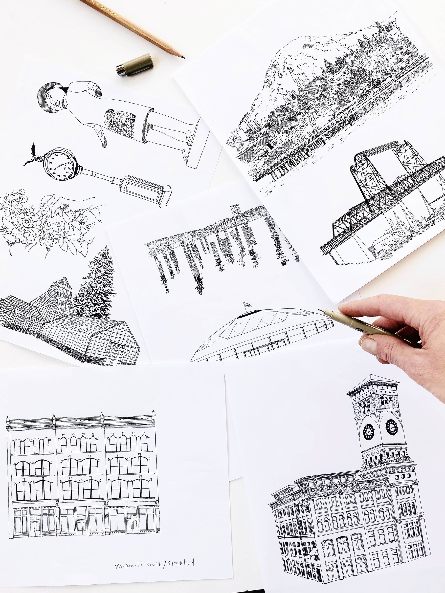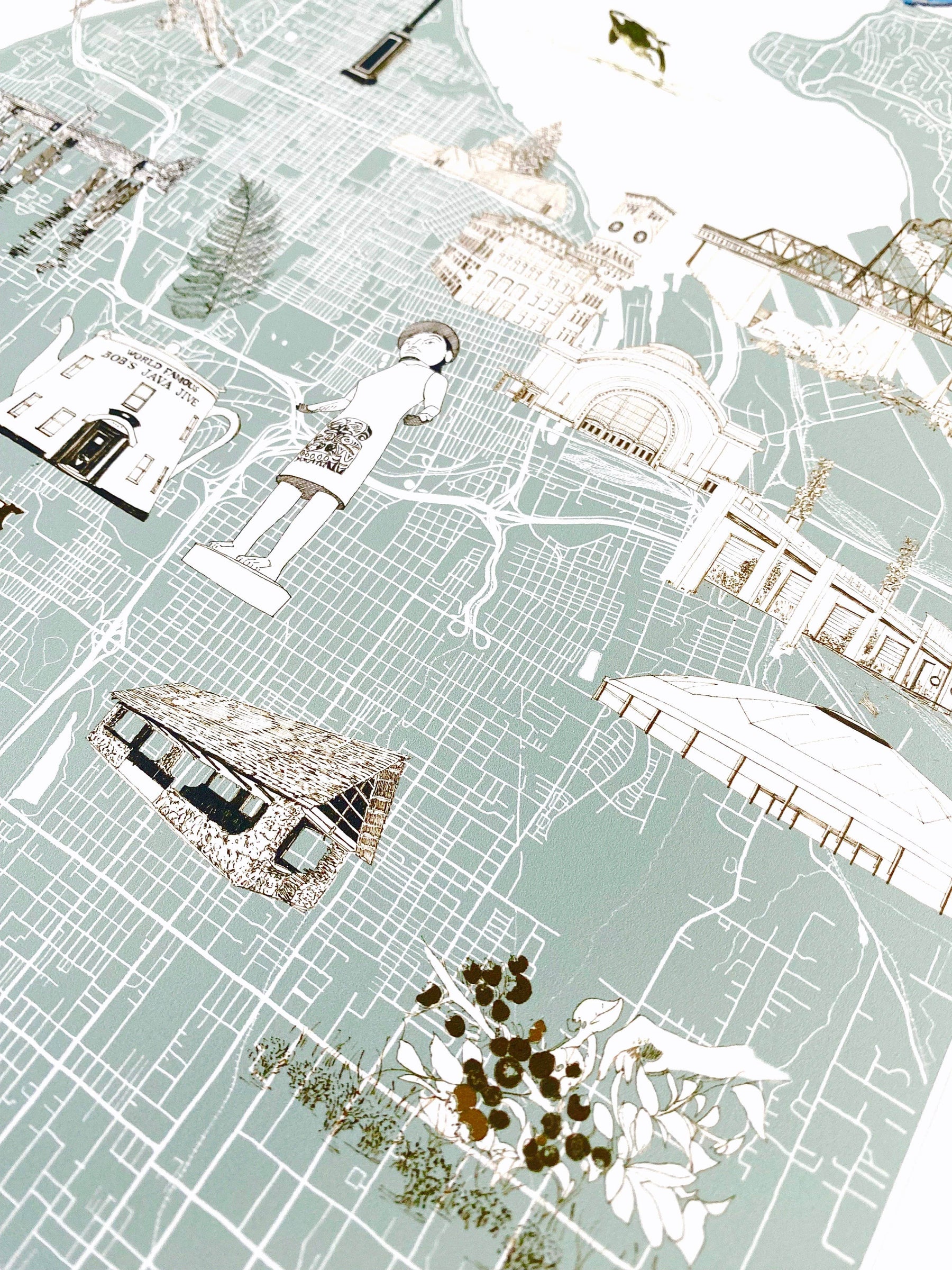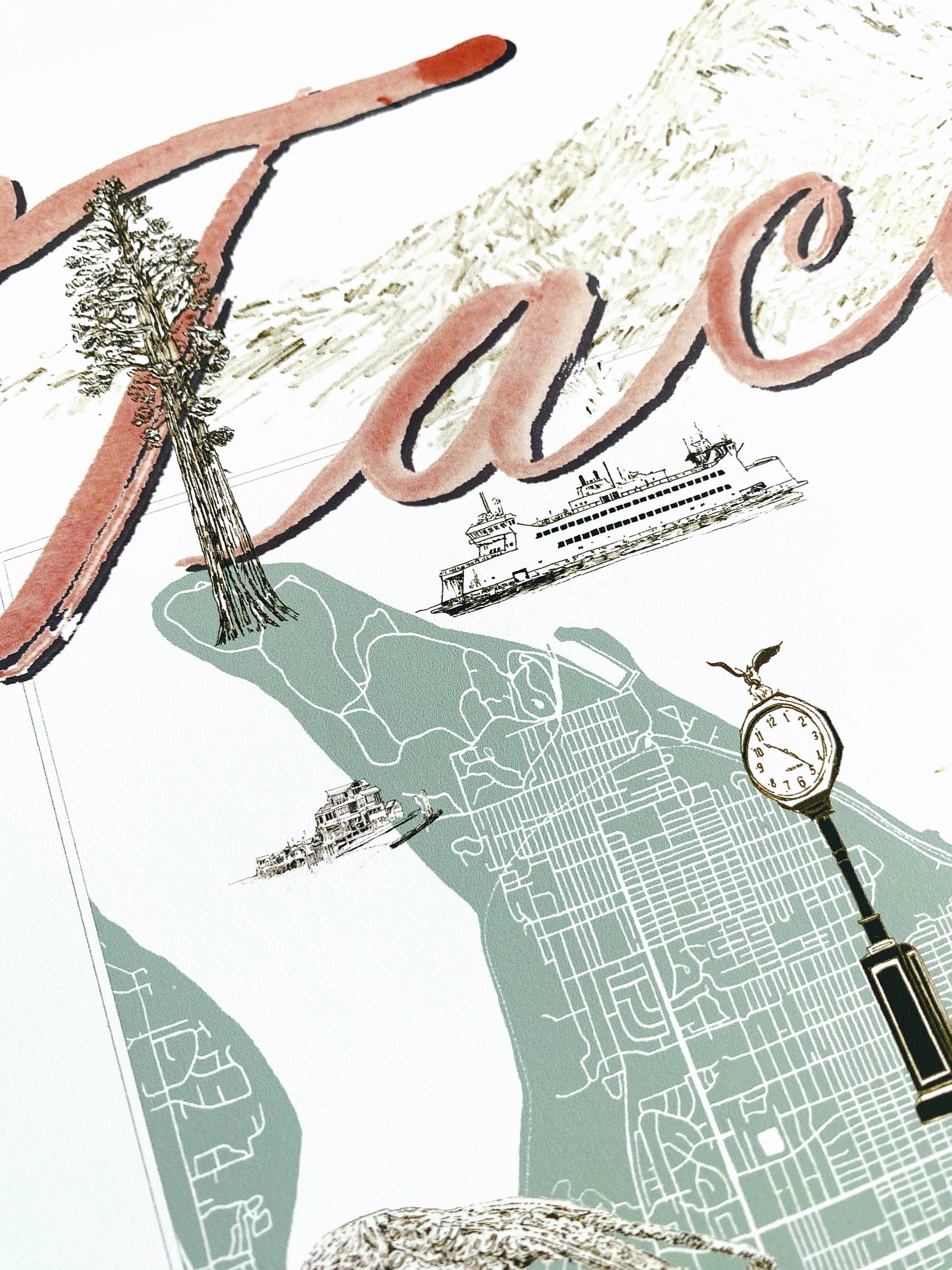 TACOMA Washington "Charms" Landmarks Map Art Prints - The hand-painted cursive TACOMA title hovers above my hand-drawn map of the city with sketches of some of T-town's icons or "charms" scattered around, roughly in the area where they exist in real life!