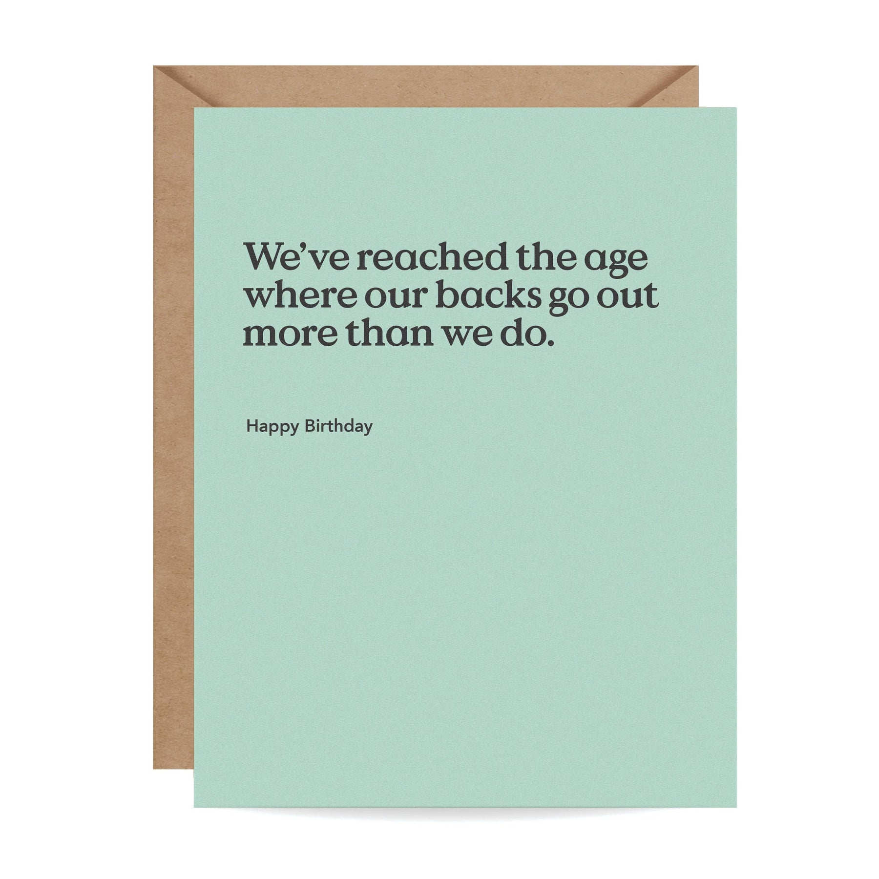 "We've reached the age where our backs go out more than we do." This humorous birthday card is printed on ultra-thick card stock and comes blank inside for your own message. Pairs well with a heating pad.