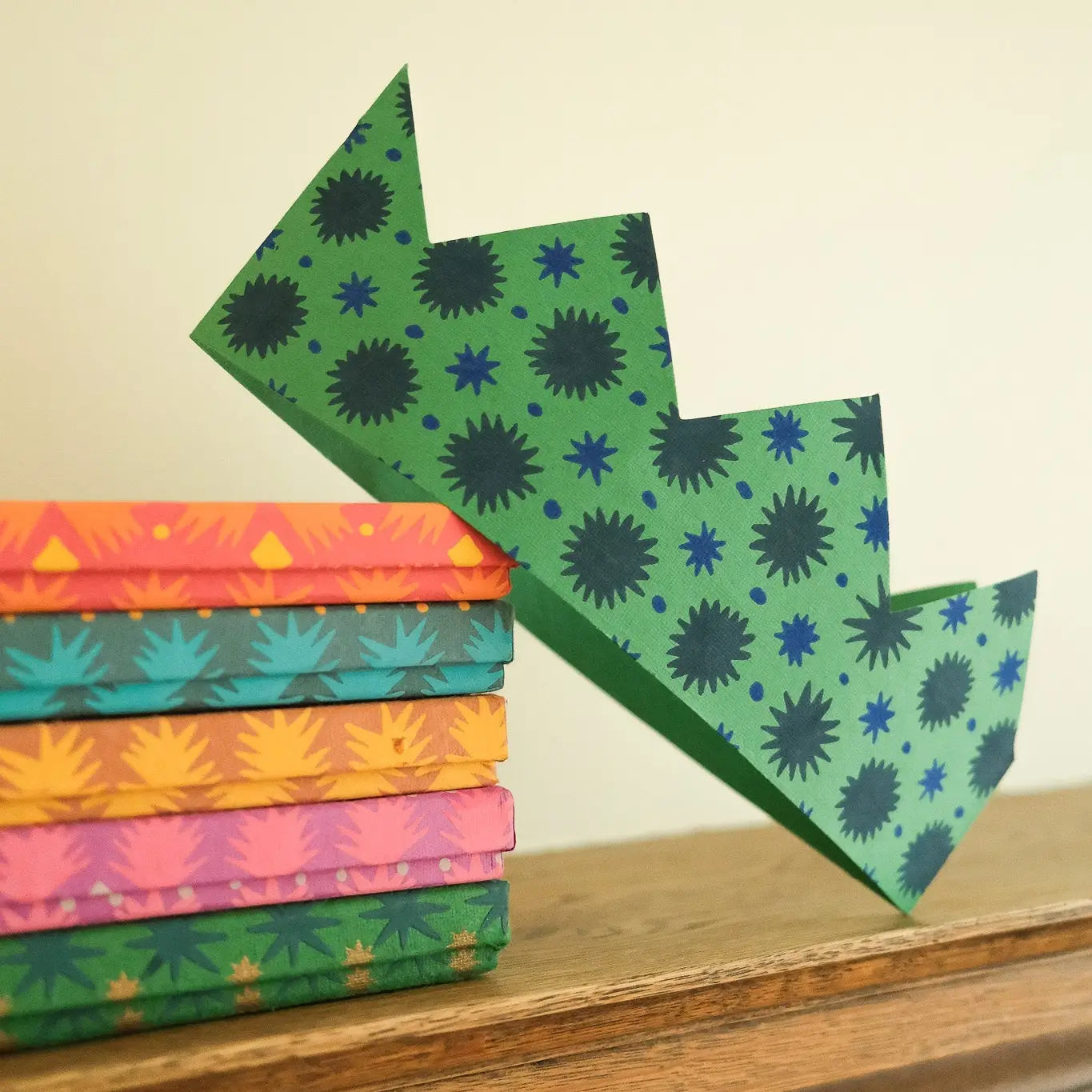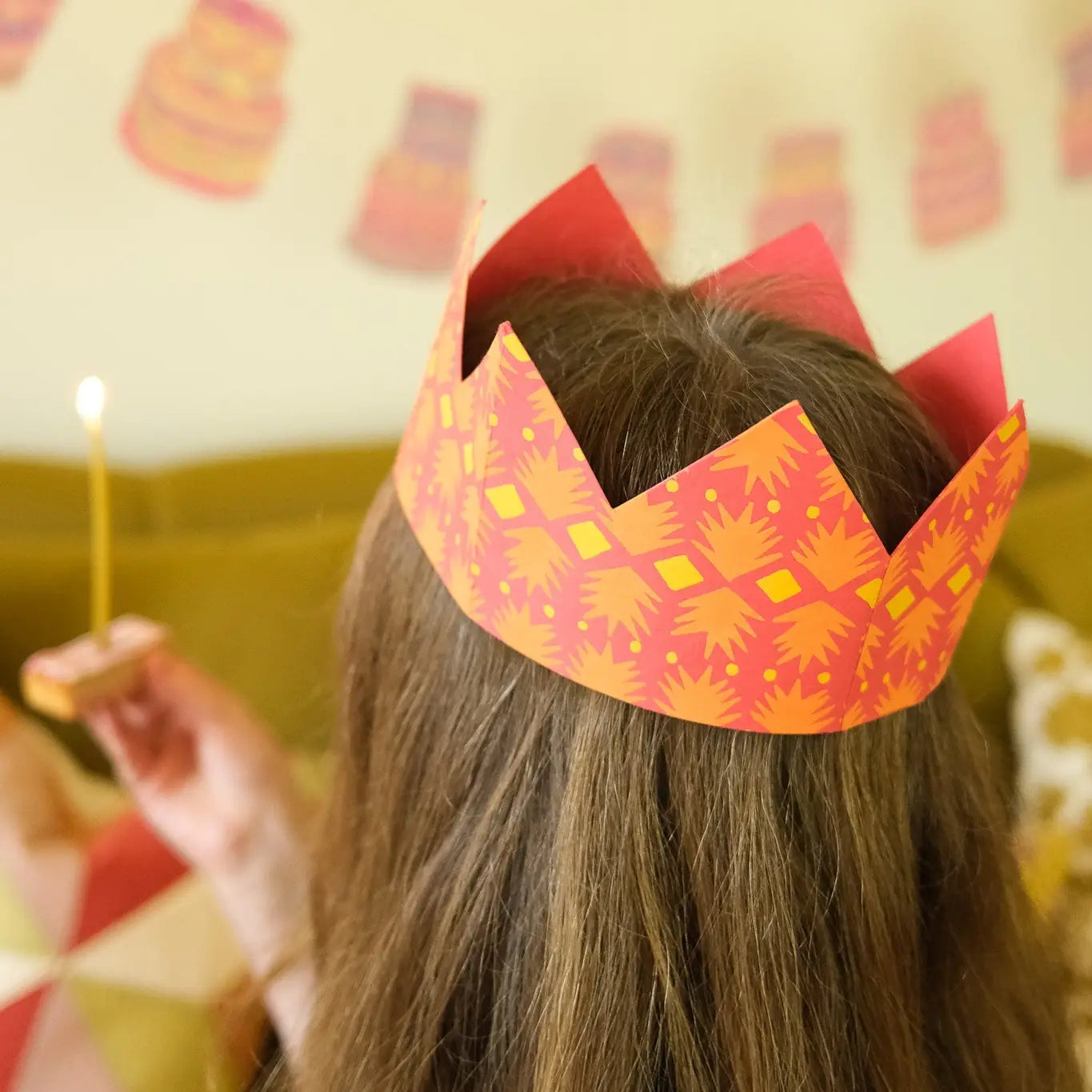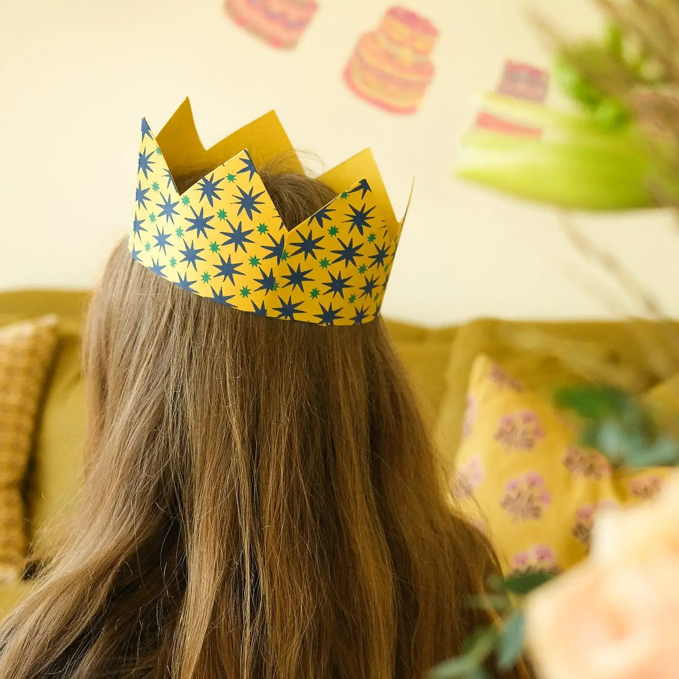 These colorful party crowns are screen printed by hand with a unique pattern onto recycled paper. Each crown is slightly different, but all have a touch of party fun! They are sturdy enough to be packed away and reused celebration after celebration. The crowns are large enough for adult heads, and perfect for adding some joy to your party.