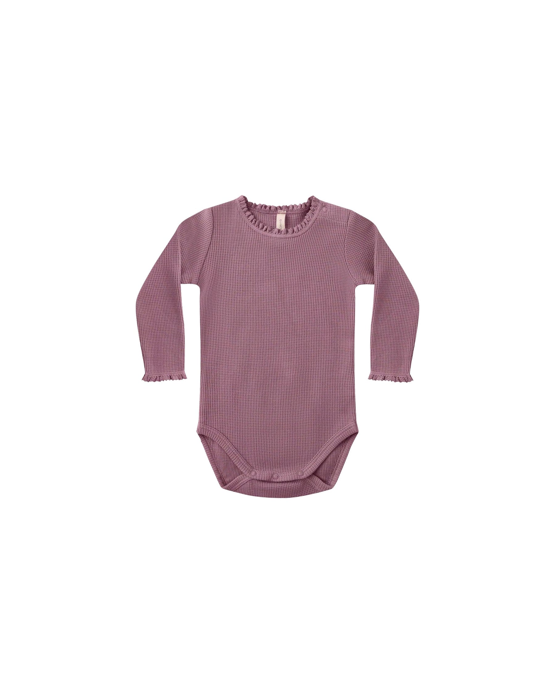 Long sleeve onesie in Quincy Mae's lightweight waffle knit, featuring the sweetest crochet lace ruffle detail. Designed with shoulder and bottom snaps for easy changes.