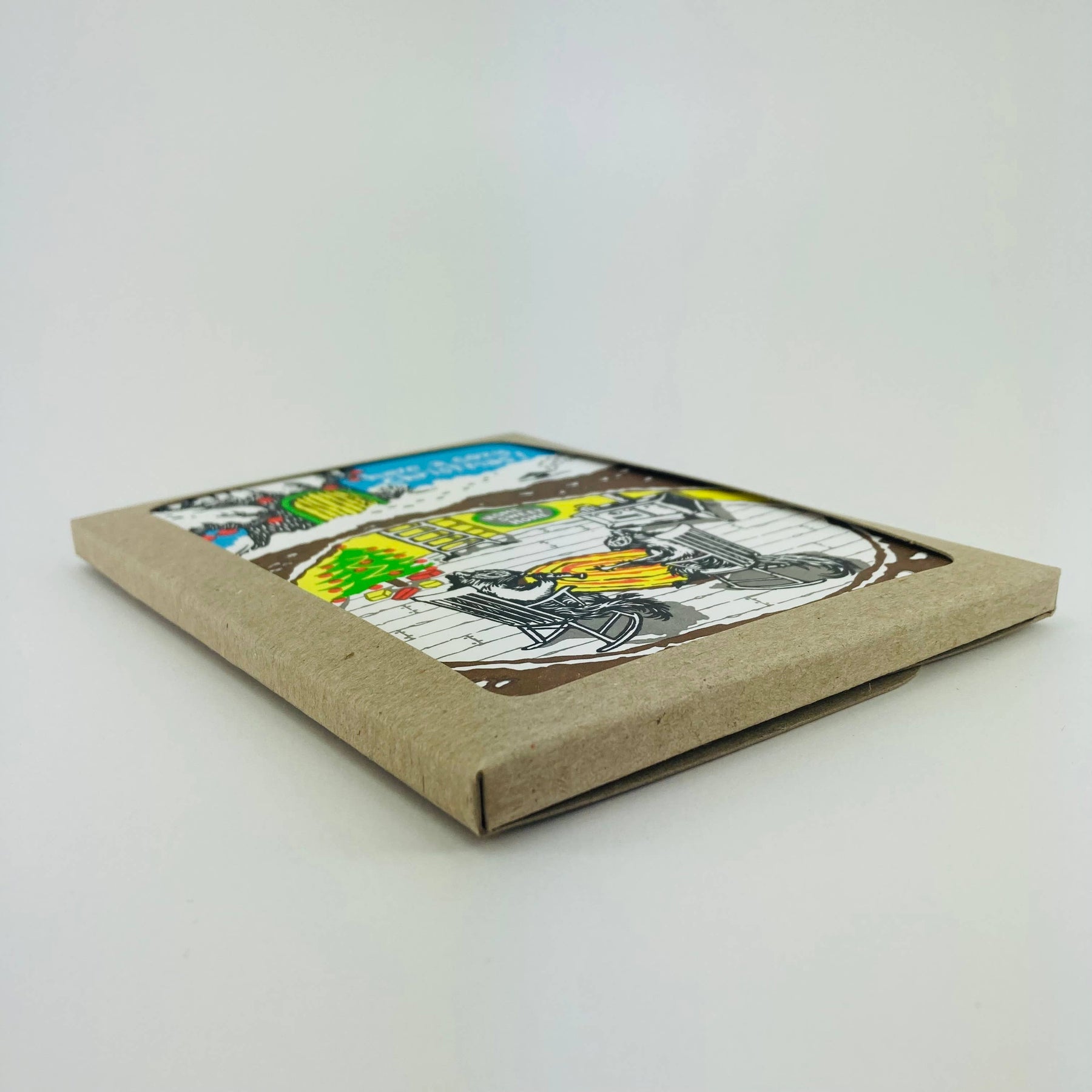 Snowy forest holiday. Squirrels in a cozy underground bungalow. Box set 6 cards and envelopes in custom chipboard box. Plastic free packaging. Letterpressed in multiple overlapping colors. Blank inside for your own message. Includes six 6 1/4" x 4 1/4" cards with six matching standard A6 square flap envelopes.