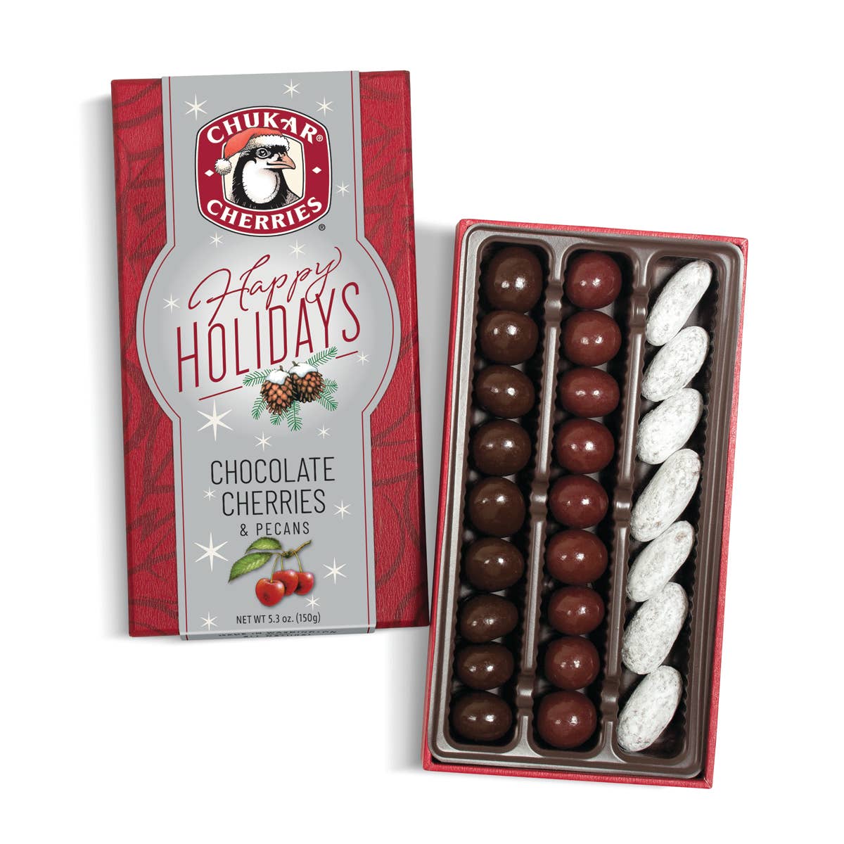 Honey Pecans and two of our most beloved chocolate cherries wrapped up for the holidays. Sized for individual decadence, this sampler delights with naturally dried cherries and praline pecans coated in fine artisan chocolate.