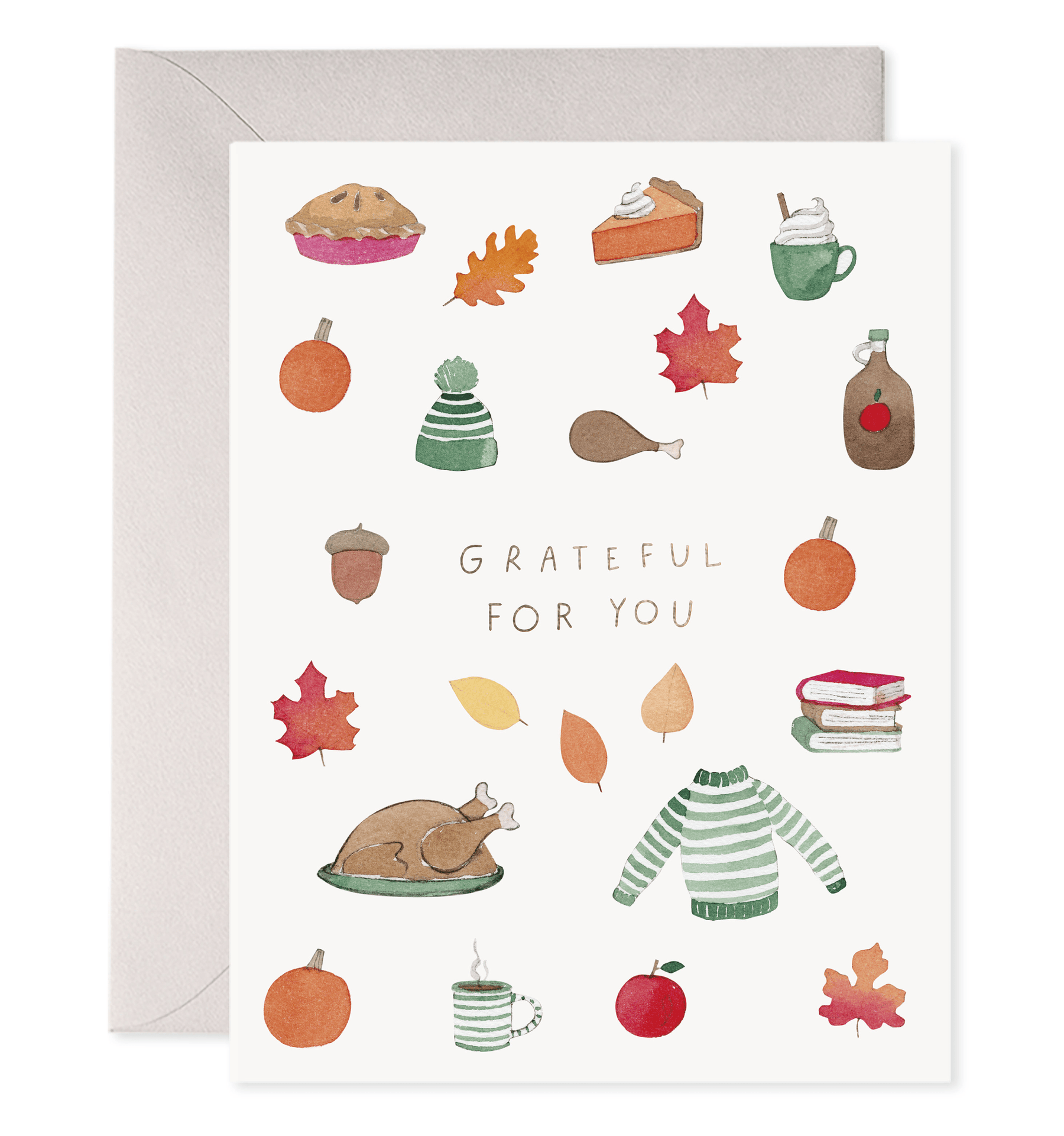 Each E. Frances card begins as an original watercolor painting, is then printed in brilliant color on luxe, heavyweight paper and is finally kissed with gold foil. Made in the USA. Express heartfelt thanks with the Crisp & Cozy Thanksgiving Greeting Card, featuring warm autumn designs and the message “Grateful For You.” Perfect for sending thanksgiving wishes, fall greetings, or showing appreciation during the harvest season. Share cozy gratitude with friends and family this autumn!