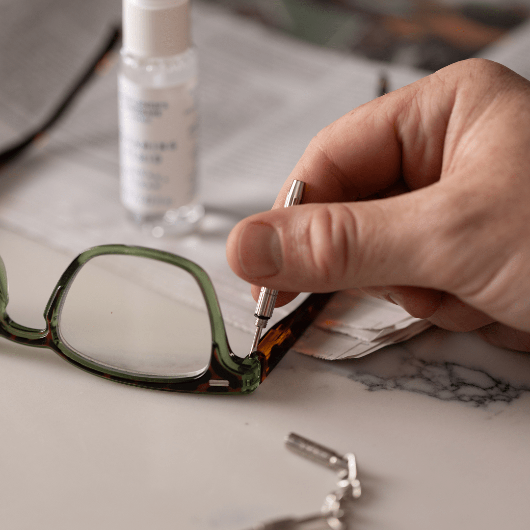 Clear things up with this compact Clean & Repair Kit. Designed to fit inside a stylish tin, this kit includes a spray bottle of cleaning fluid and a cleaning cloth to tackle stubborn fingerprints and smudges that appear on lenses and screens. Also includes a mini screwdriver for repairing glasses on the go!