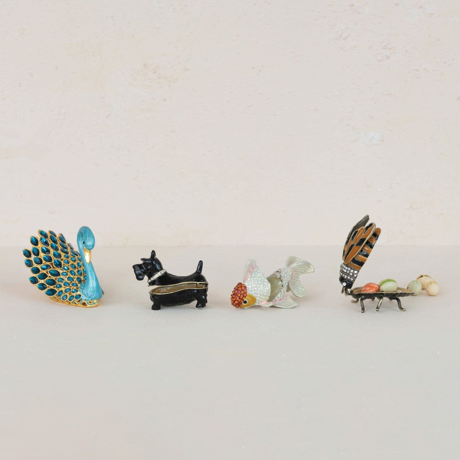 Charming bee-shaped trinket box crafted from enameled metal with a gleaming gold finish. This petite keepsake measures 1-3/4" long by 2-1/4" wide, making it perfect for storing small treasures, jewelry, or trinkets. The vibrant orange and black enamel design is adorned with sparkling jewels that catch the light beautifully. An ideal gift for nature lovers, collectors, or anyone who appreciates whimsical home décor and functional beauty.