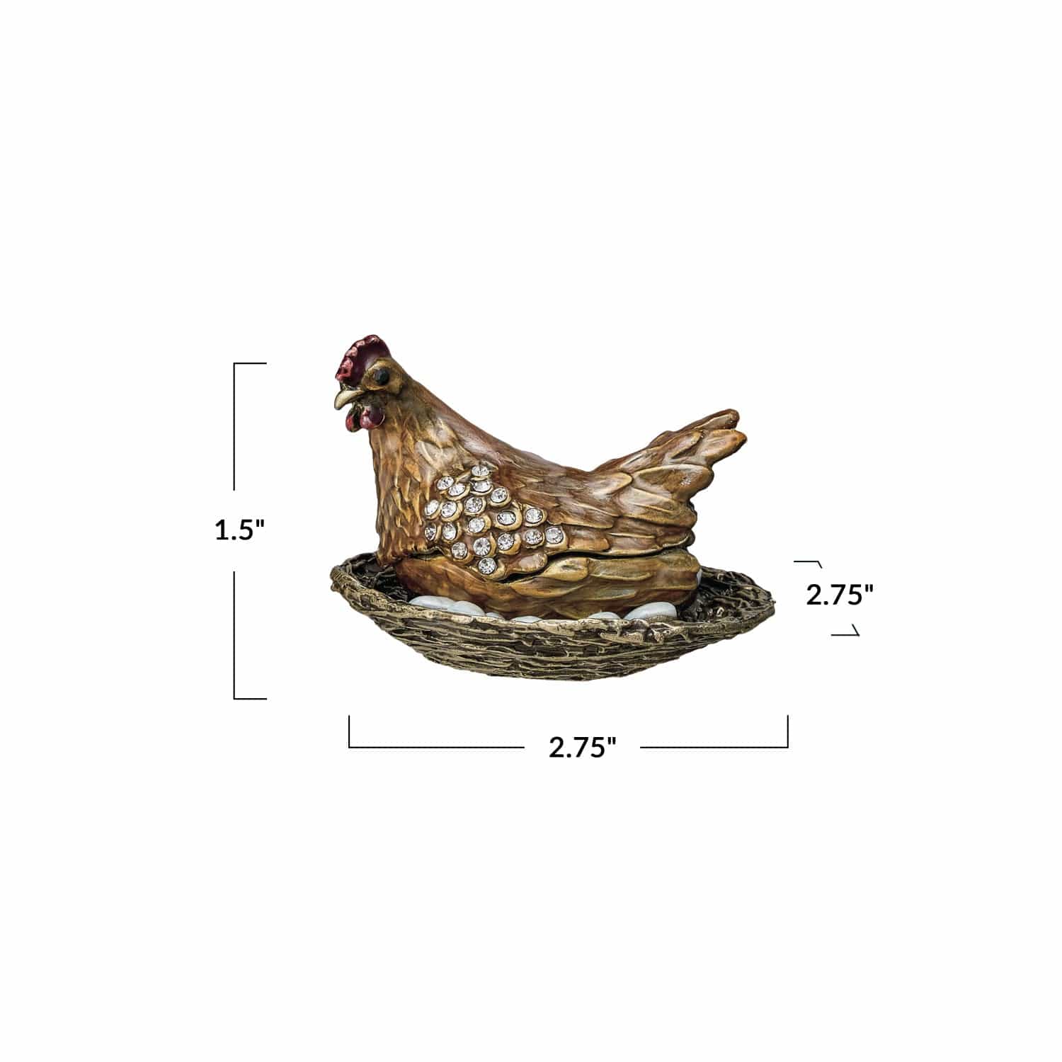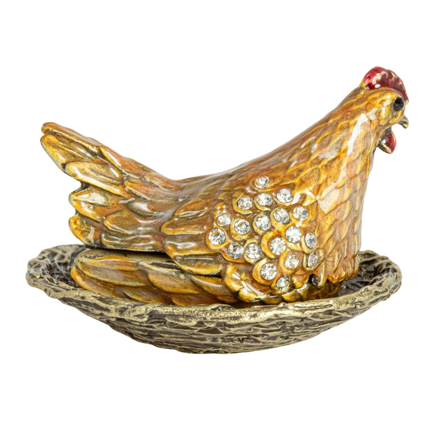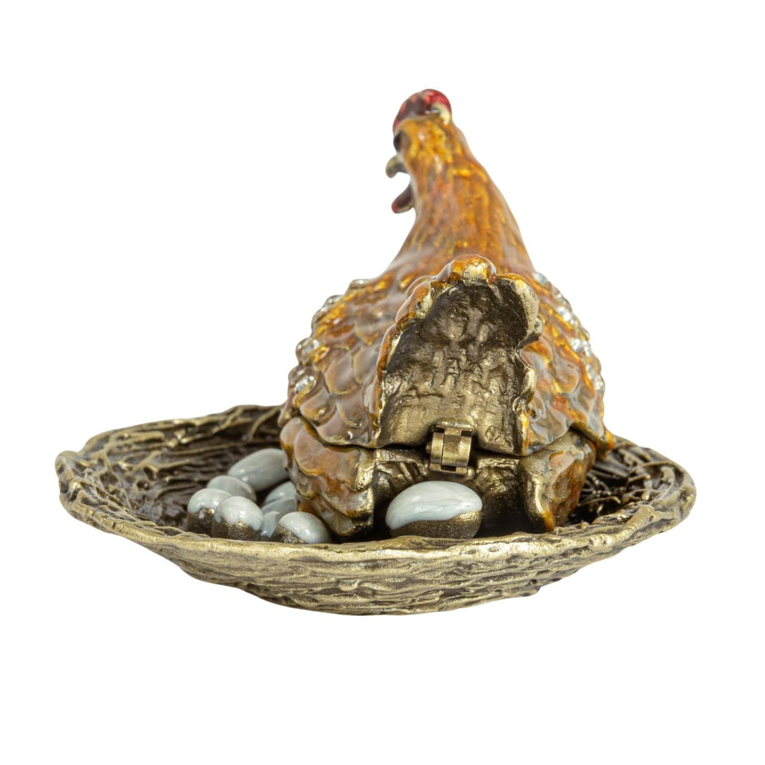 Enameled Metal Hen On Nest Shaped Trinket Box with Jewels
