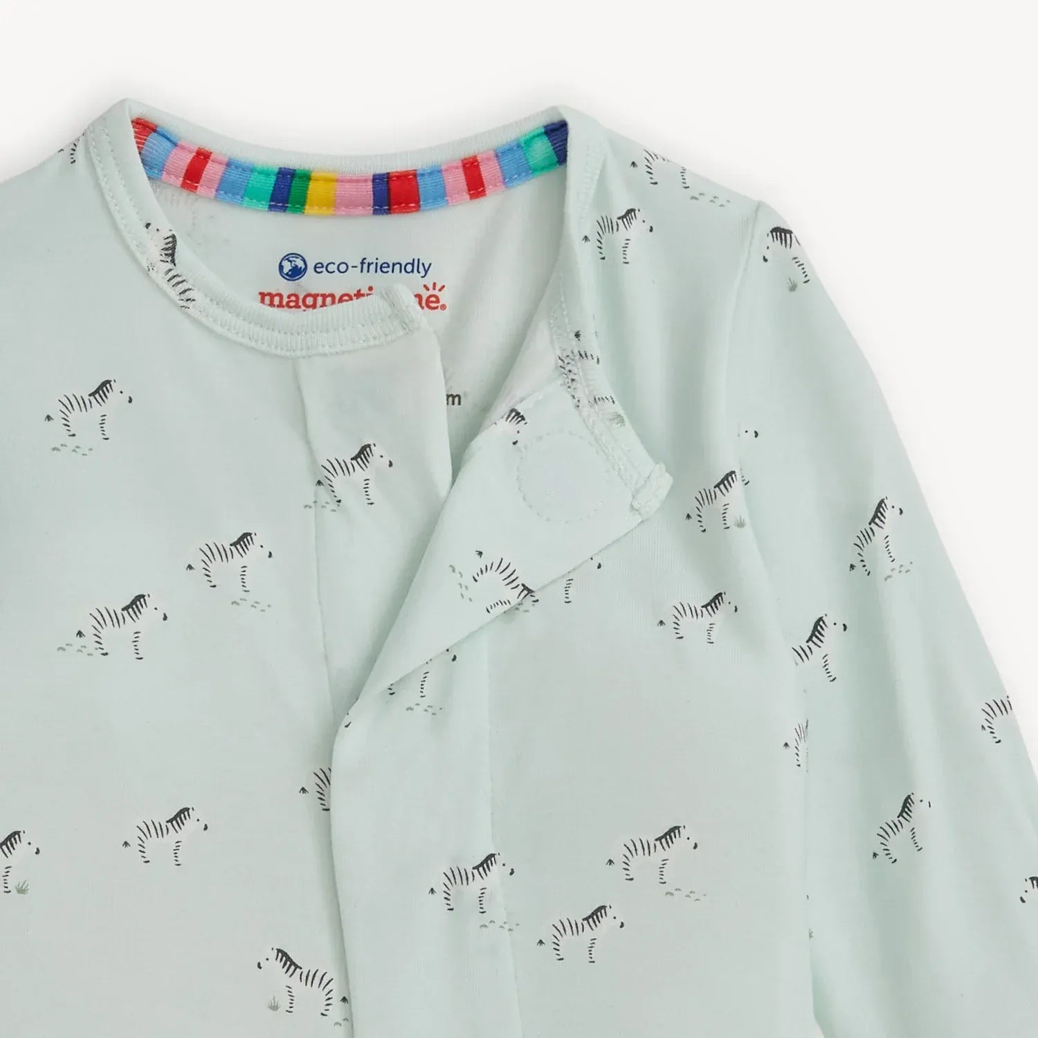 • Magnetic closures: magnets line the seam from the neck to upper thigh for sizes up to 0-3m & from neck to crotch for sizes 3-6m and up.