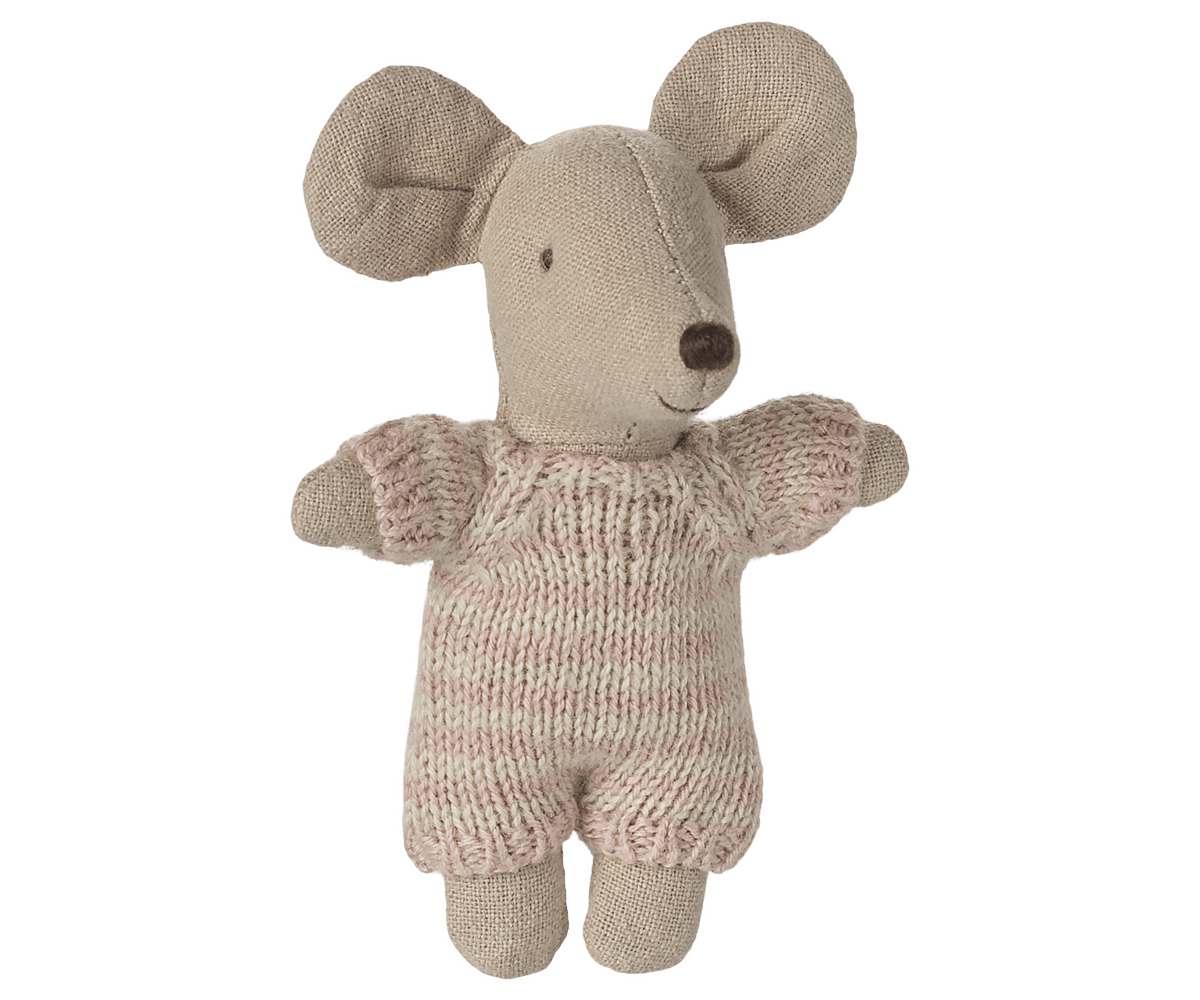 A small baby mouse in a soft and striped knitted suit. It sleeps for hours in its little quilted carry cot.
