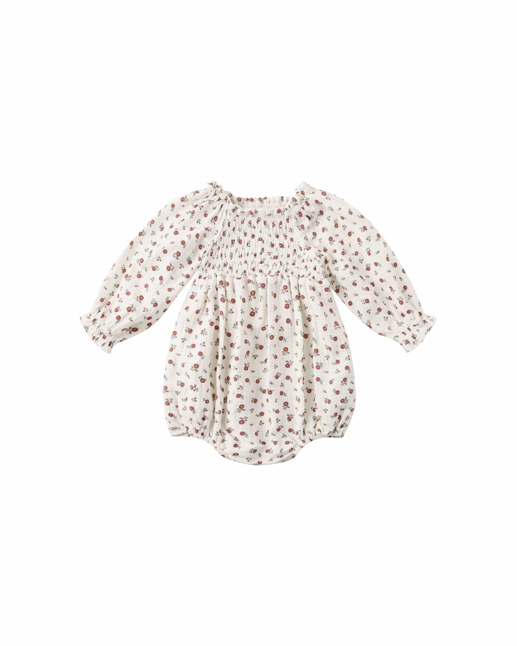 The Eden Romper features delicate smocking across the chest, gathered ruffle details at the wrists, and a sweet ruffled neckline—an effortlessly charming piece for your little one.
