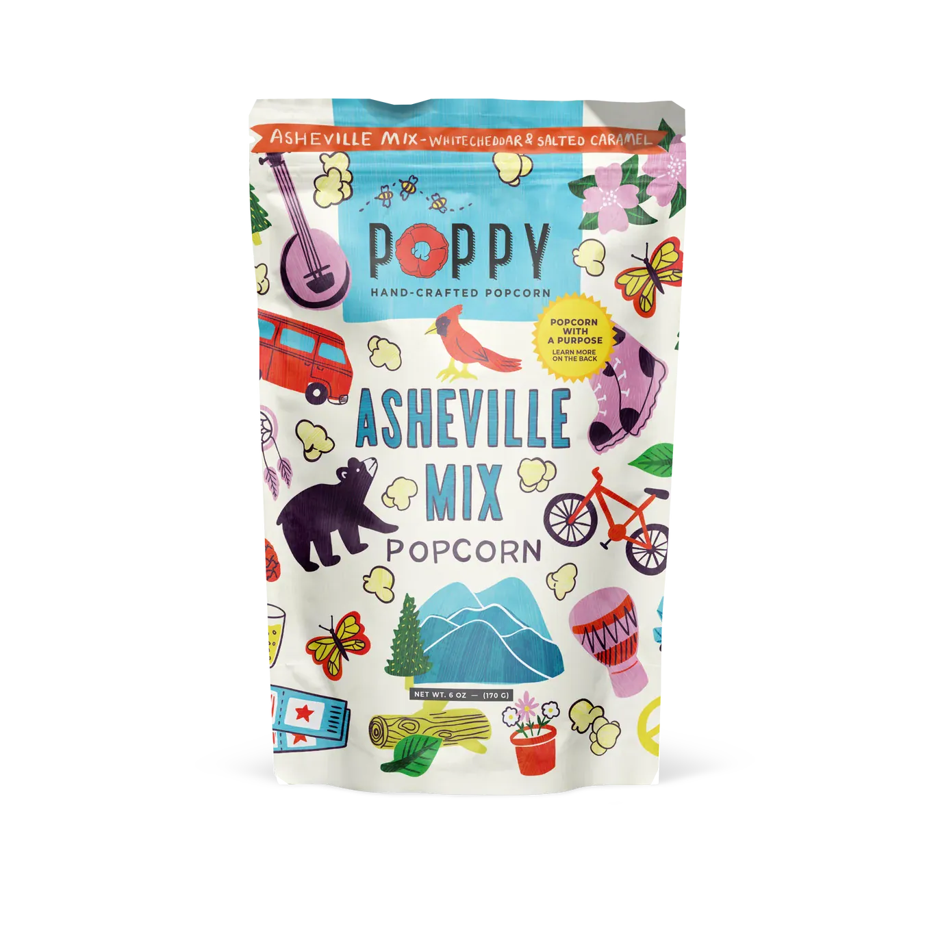 This vibrant bag, created in collaboration with Asheville artist Annie Riker, celebrates creativity, community, and the spirit of our mountain home. It’s a meaningful addition to your shelves for customers who love great popcorn and want to support something bigger—one bag at a time.'