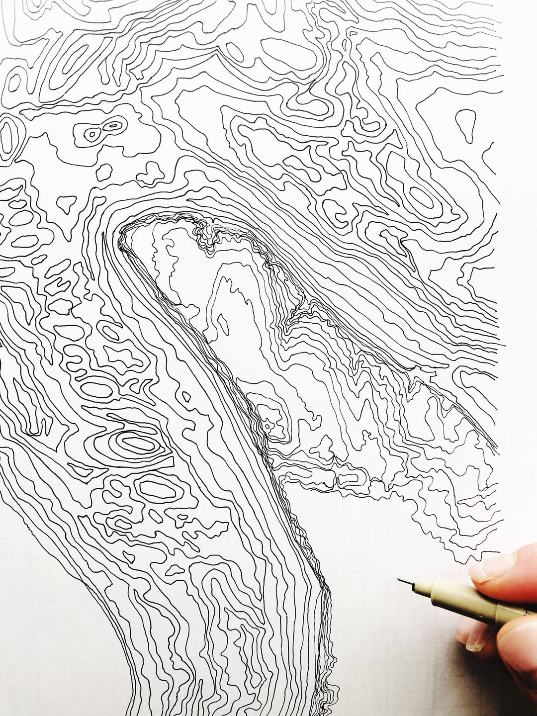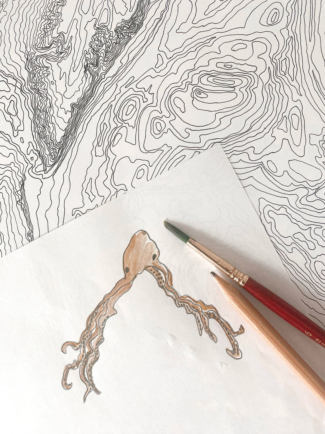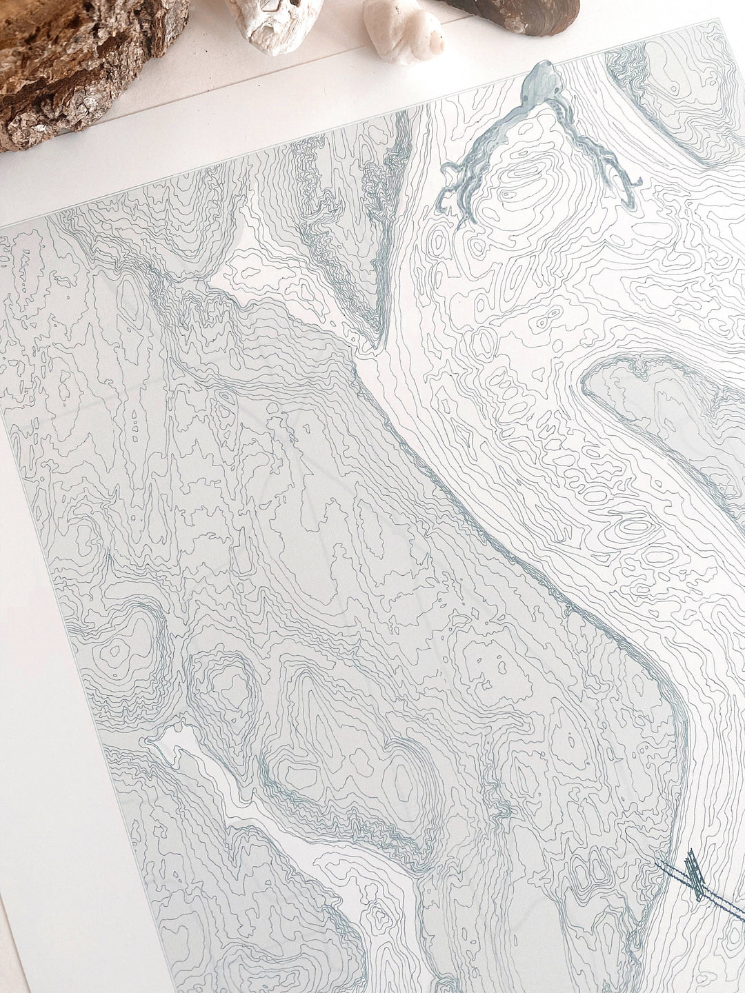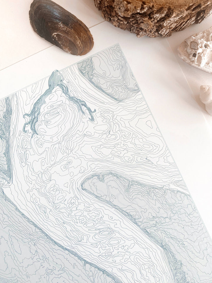 This is a PRINT of my hand-drawn topographic hachures and bathymetric lines in greens to match Maps of: Whidbey, San Juans, South Sound, Vashon, Anacortes... I also sketched the bridge rising within the map, an elevation of the the bridges along the bottom frame and - surprise! - an octopus blending into the bathymetric lines of the Colvos Passage, at the top frame. Epson Professional high-quality inkjet printer / Archival inks Original drawing. Print is signed & dated by me. Packaged neatly in clear cello sleeve and white backboard.