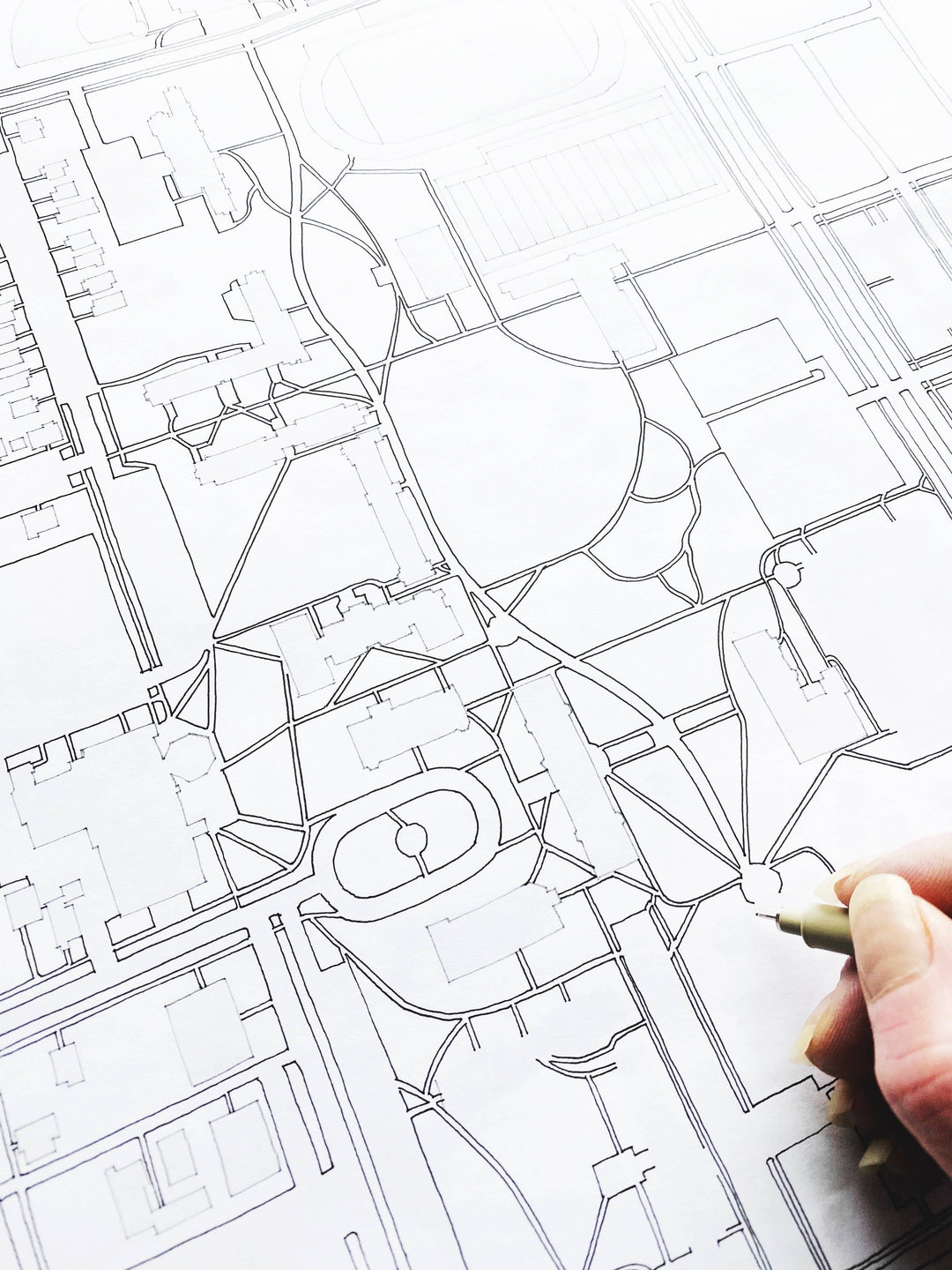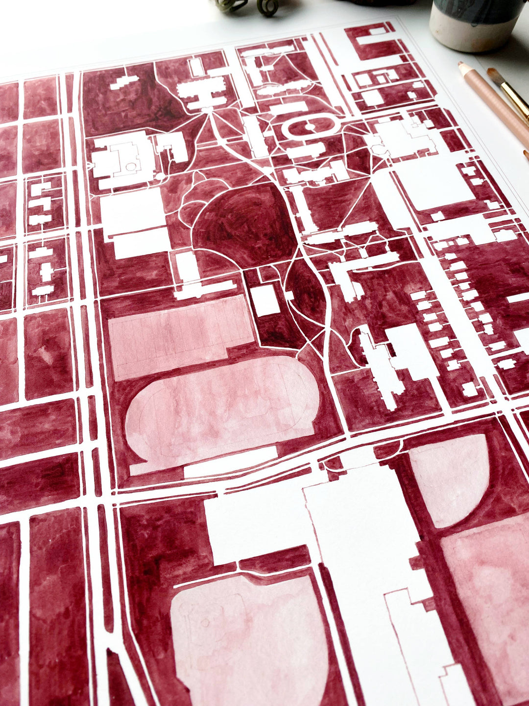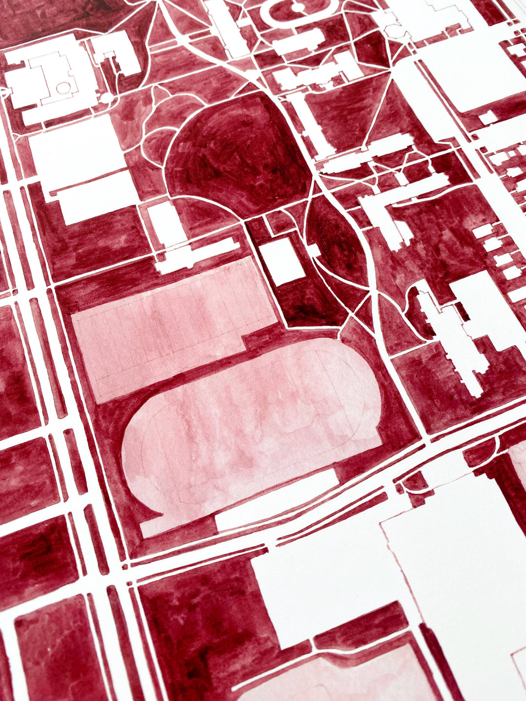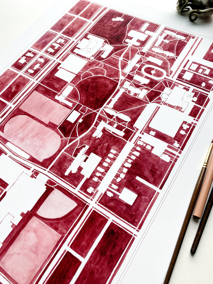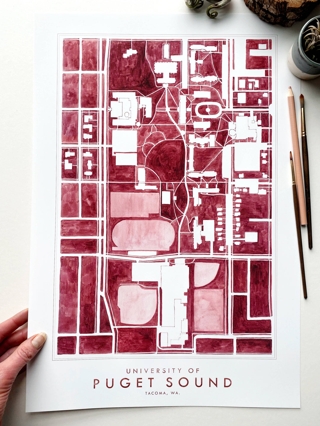 UNIVERSITY OF PUGET SOUND, Tacoma Washington. Watercolor Campus Map Art Prints - Show some love for your favorite university and campus! This is a PRINT of an original hand-painted watercolor painting in variegated tones of maroon.