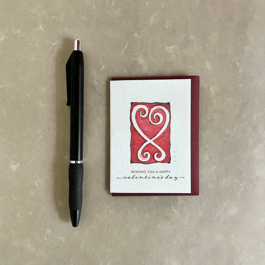One blank 2.5 x 3.5 folded card and complimentary envelope. The swirly heart artwork was originally illustrated, carved, colored and stamped by hand, and then electronically generated. The enclosure card is printed on luxurious 140 lb white cotton card stock and embellished with a personal touch of glitter.