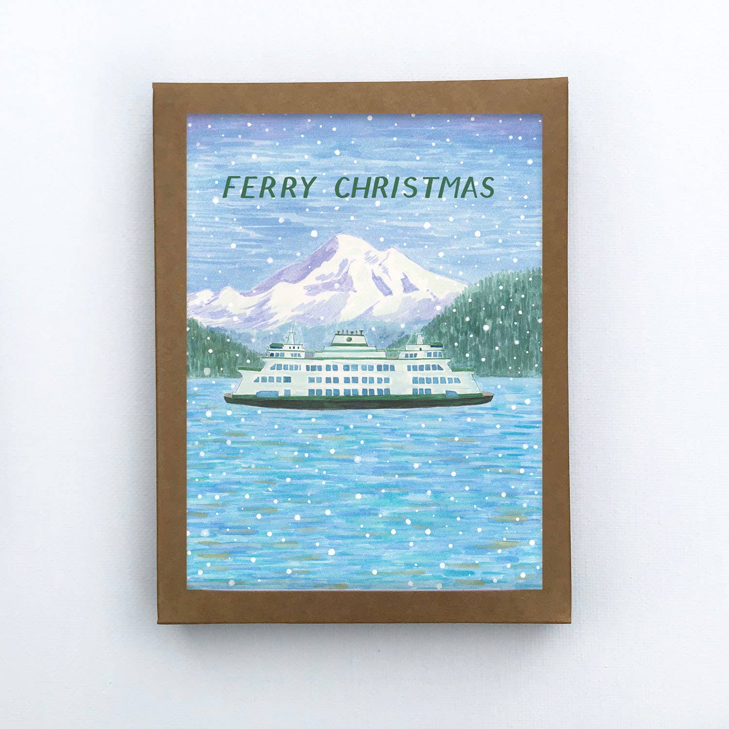 This box set includes 6 Ferry Christmas cards and corresponding kraft envelopes. The watercolor illustration of a Washington State ferry with a snowy background of Mount Rainier and the Puget Sound, along with the punny message is the perfect way to spread joy and cheer to your loved ones, with a Pacific Northwest twist. This box set includes 6 cards of the same design, with 6 kraft envelopes. Each card measures 4.25" x 5.5". A2 Size. 100% recycled paper (cards and envelopes). Made in USA. Folded cards, blank inside. Kraft box with open window. Plastic free. Boxed sets may not be separated. Also available as a single card.