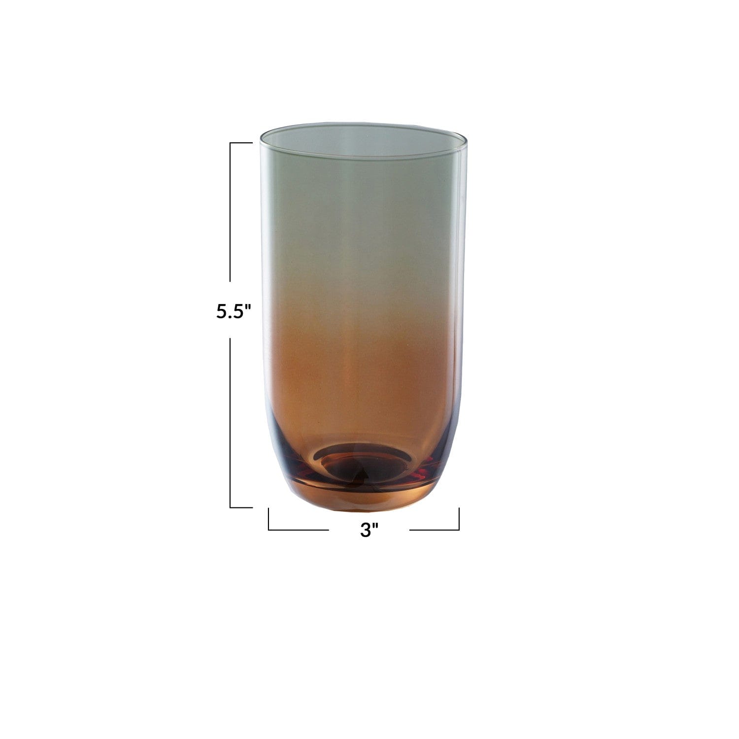 This 16 oz. drinking glass features an iridescent finish with a beautiful blend of amber and green ombre colors. Its vibrant design adds a unique touch to your drinkware, making it ideal for both everyday use and special occasions. Stylish and practical, it offers a comfortable hold and generous capacity.