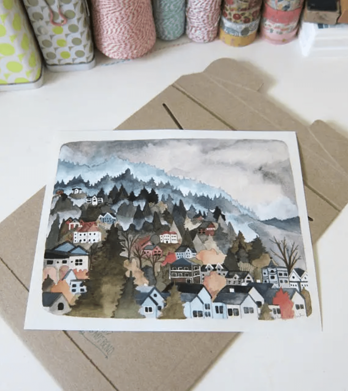 This is a reproduction print of an original watercolor painting of Portland's West Hills.