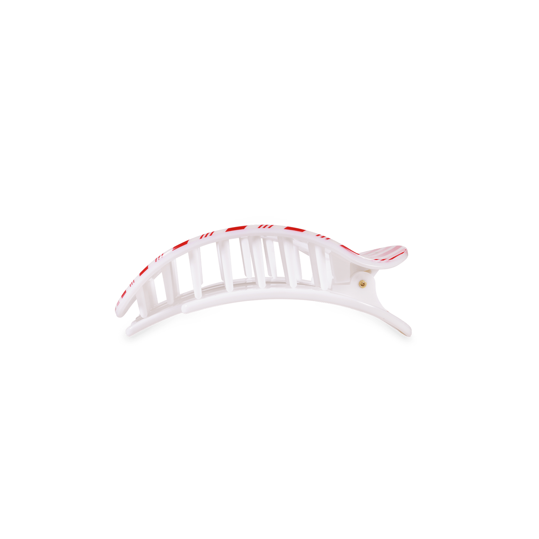 Lay flat and relax with the new TELETIES Candy Cane Crush Small Flat Round Hair Clip in Red and White Stripes. This hair clip is designed to allow you to lay back flat, do yoga, or sit comfortably in a seat with a headrest, and it is made with the same material that is nearly unbreakable. Lay down flat with comfort Bendable teeth for a secure yet gentle hold Lightweight, durable, and suitable for all hair types Perfect for all-day wear—from sunup to sundown The small size is 3.4 inches long.