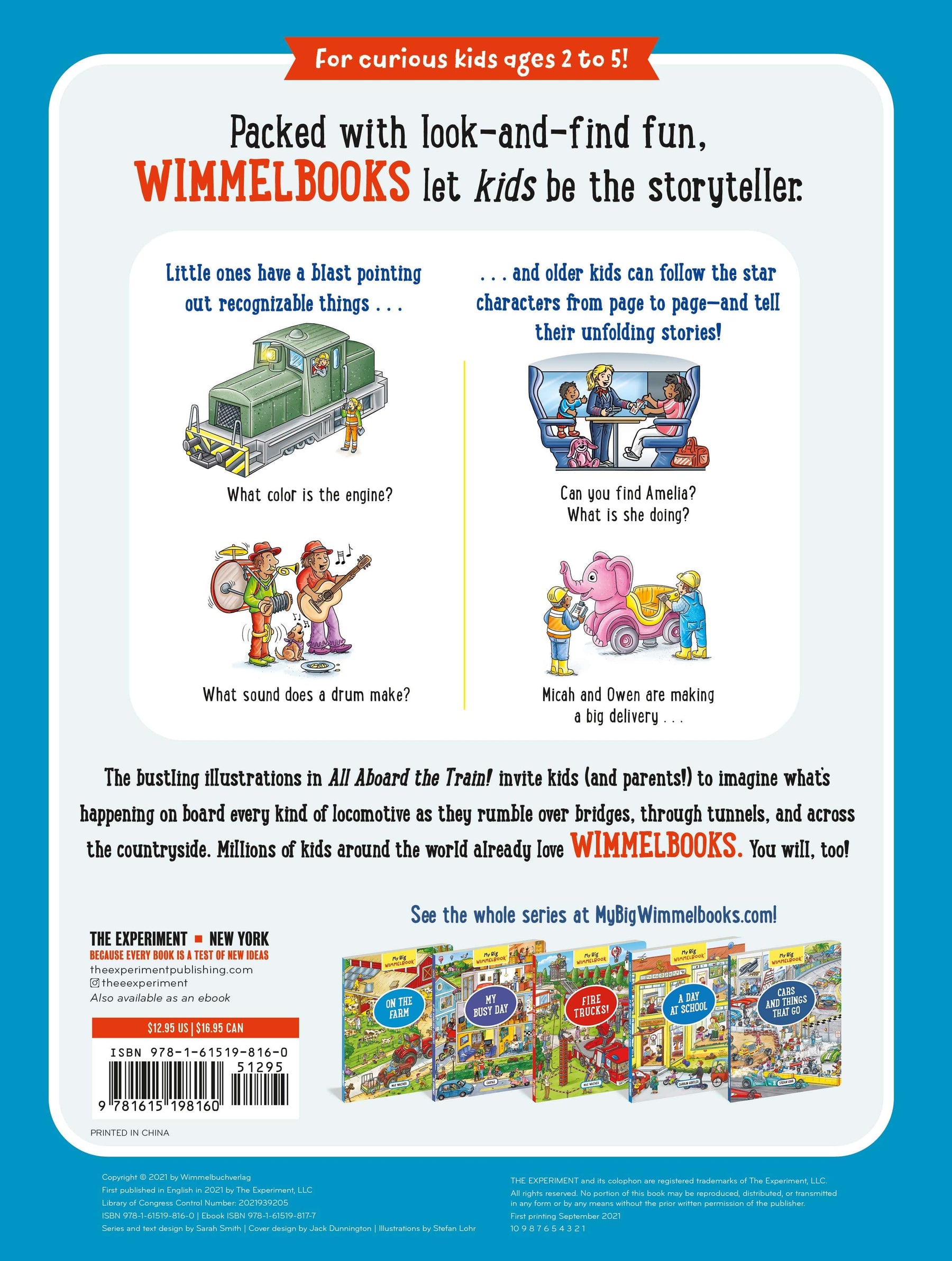 My Big Wimmelbook—All Aboard the Train! takes kids on a few fun train rides as a busy cast of characters go on journeys from Wimmeltown Train Station to their final destinations. From boarding the crowded platform to wandering through the aisles upon aisles of train cars, watching the pretty scenery, and more—plenty of interesting things are happening along the way. All aboard!