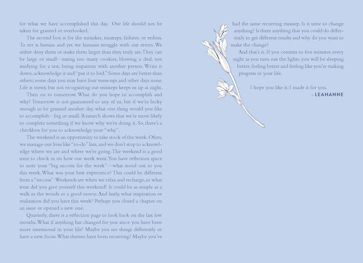 Do you often find yourself tossing and turning at bedtime, worrying about stuff that happened during the day or things you need to do? This simple, beautifully illustrated journal helps clear out the stressful thoughts so you can fall asleep, with three simple questions in squares—What was one success you had today? What’s one thing you would’ve liked to have done differently? What’s one goal you’d like to achieve tomorrow?—and one square of checkboxes with the whys for your goal. Weekends are covered in reflective pages that allow you to look back and ahead, and inspiring quotes from famous writers, thinkers, leaders, and entertainers are scattered throughout.